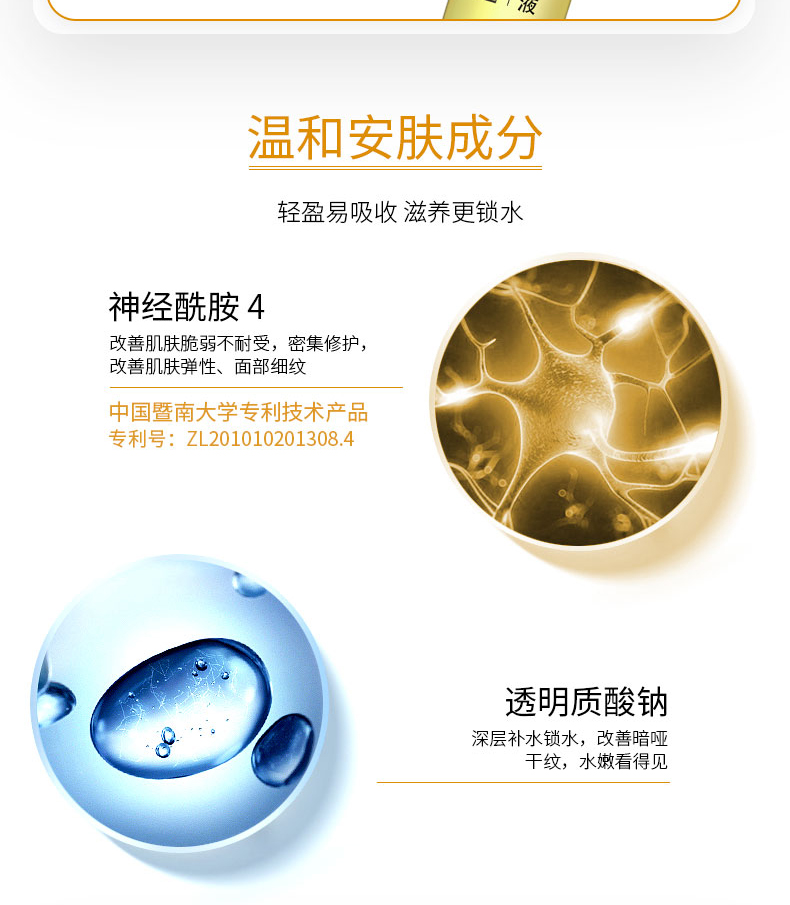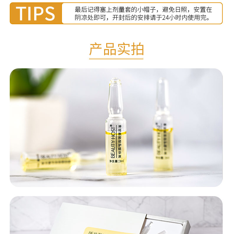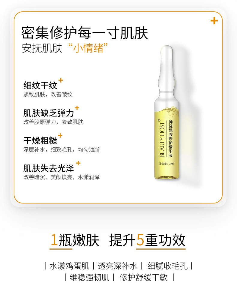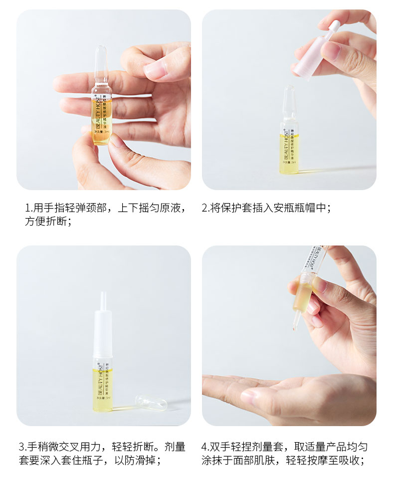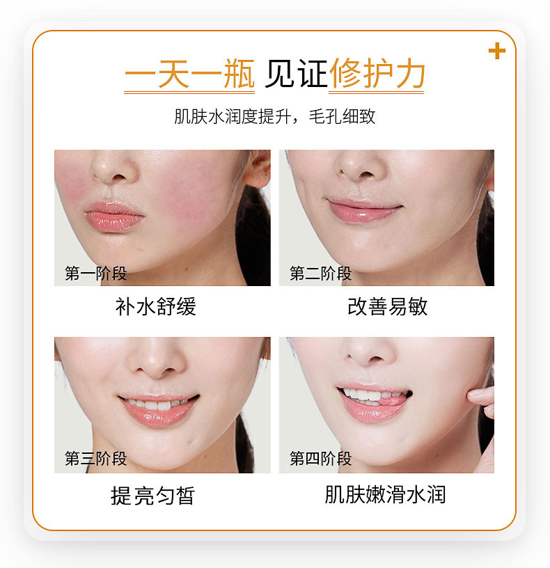 能帮助肌肤改善细纹,干燥,焕亮肤色,令肌肤滋润透亮。一支修护精华液,能修护肌肤,维持肌肤稳定,而普通精华液只能起到简单的保养作用。一天一支给你的颜值加分,滋润亮泽小脸蛋