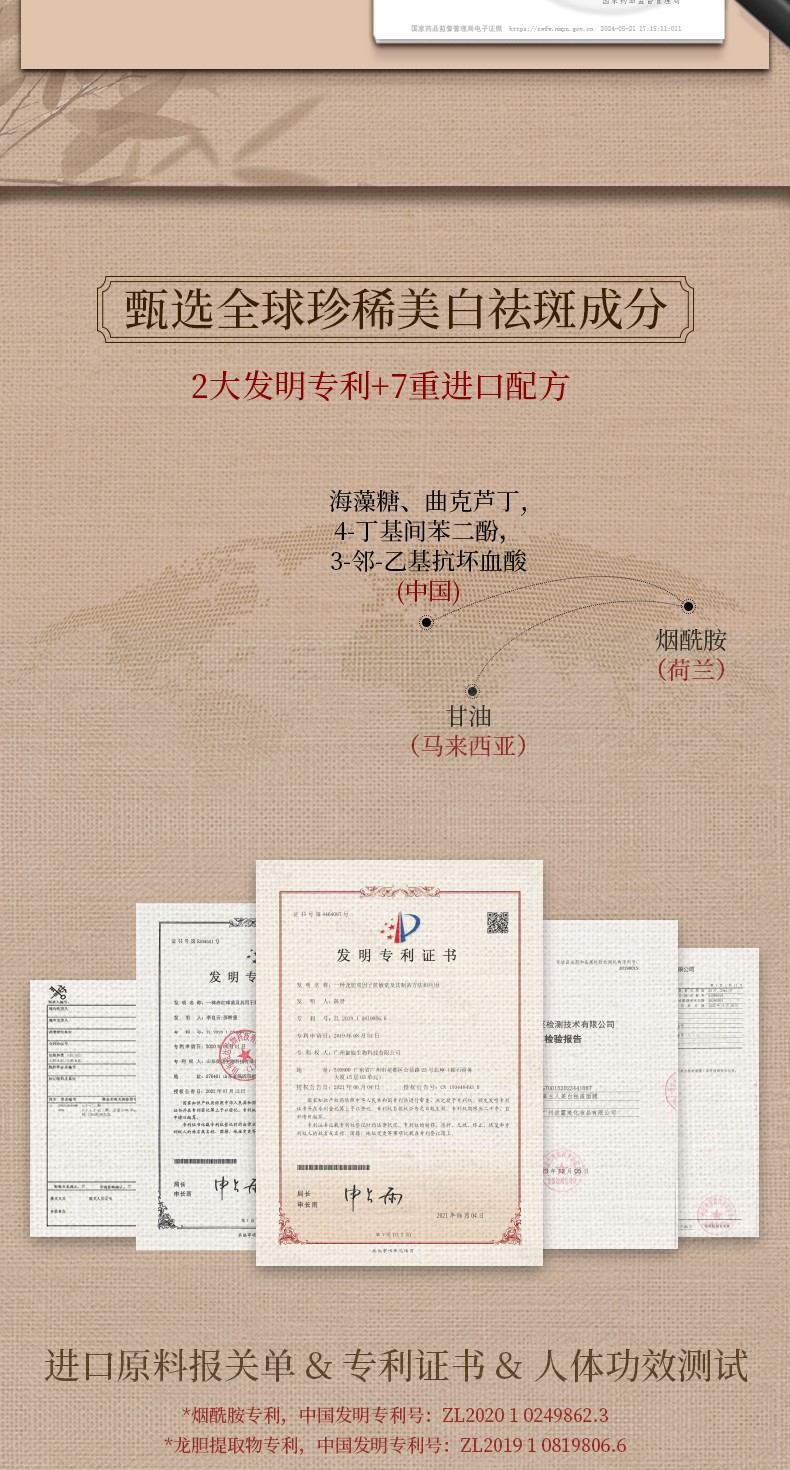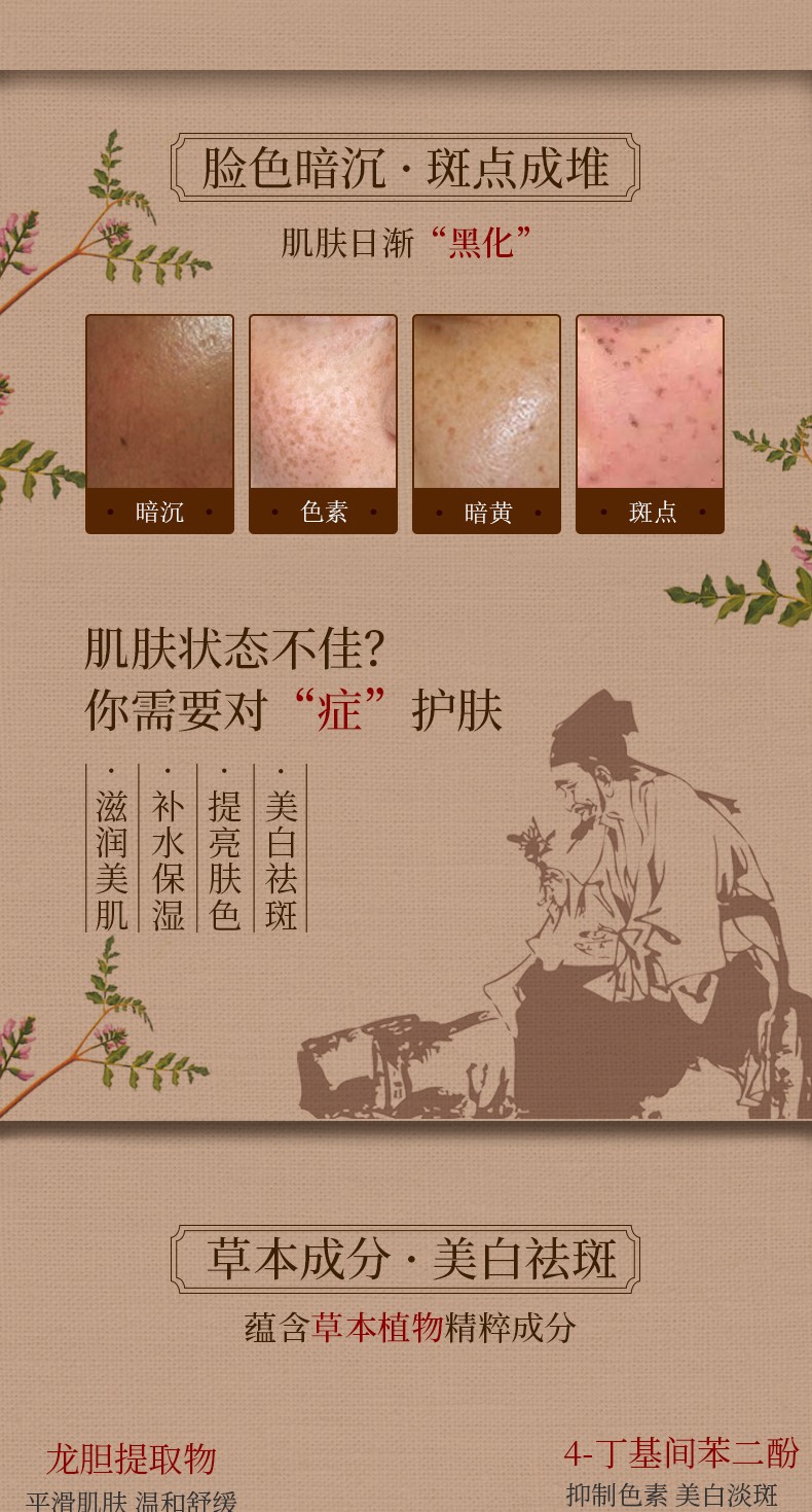 抑制黑色素,美白祛斑,盈润透亮,淡化深色痘印,改善肌肤暗沉缺水,缔造透、亮、白、润,无瑕美肌