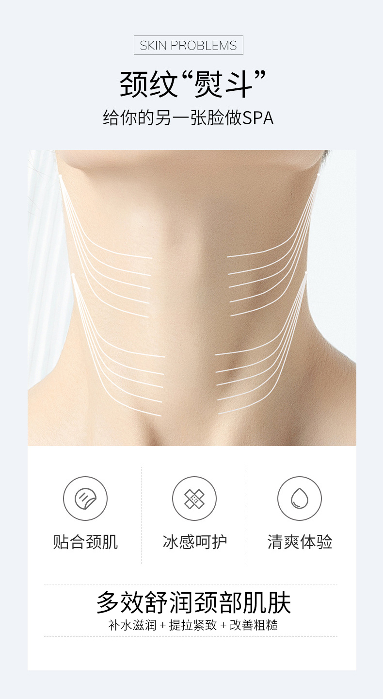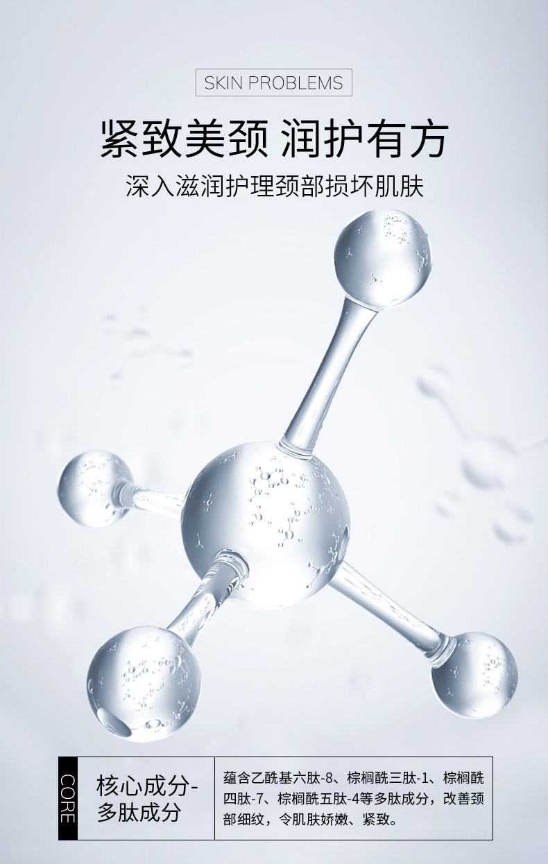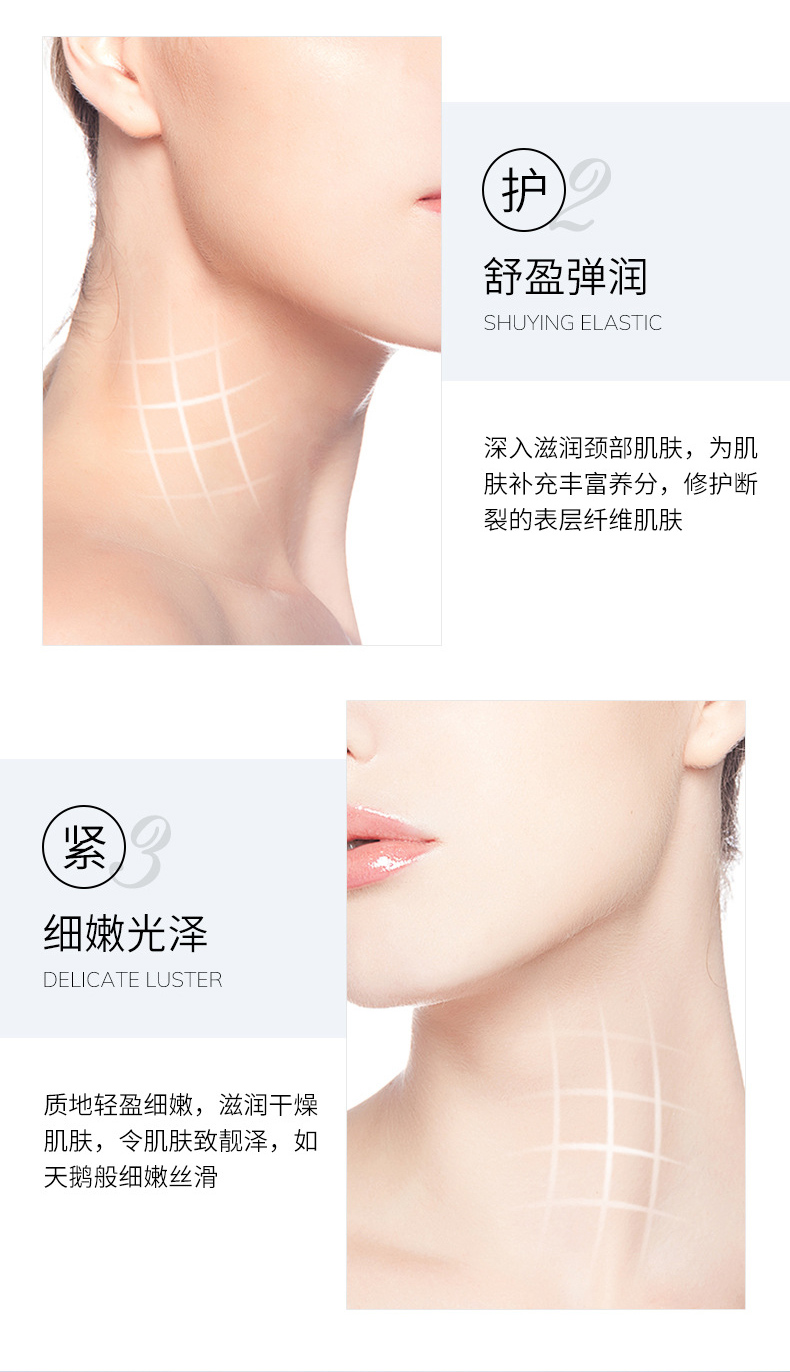 包含着多肽(乙酰基六肽-8、棕榈酰三肽-1、棕榈酰四肽-7、棕榈酰五肽-4),能提拉肌肤,使颈部紧致显年轻。以及积雪草提取物、齿叶乳香树脂提取物等修护成分,可以保湿滋润,提亮颈部肤色,打造雪亮光感颈部。