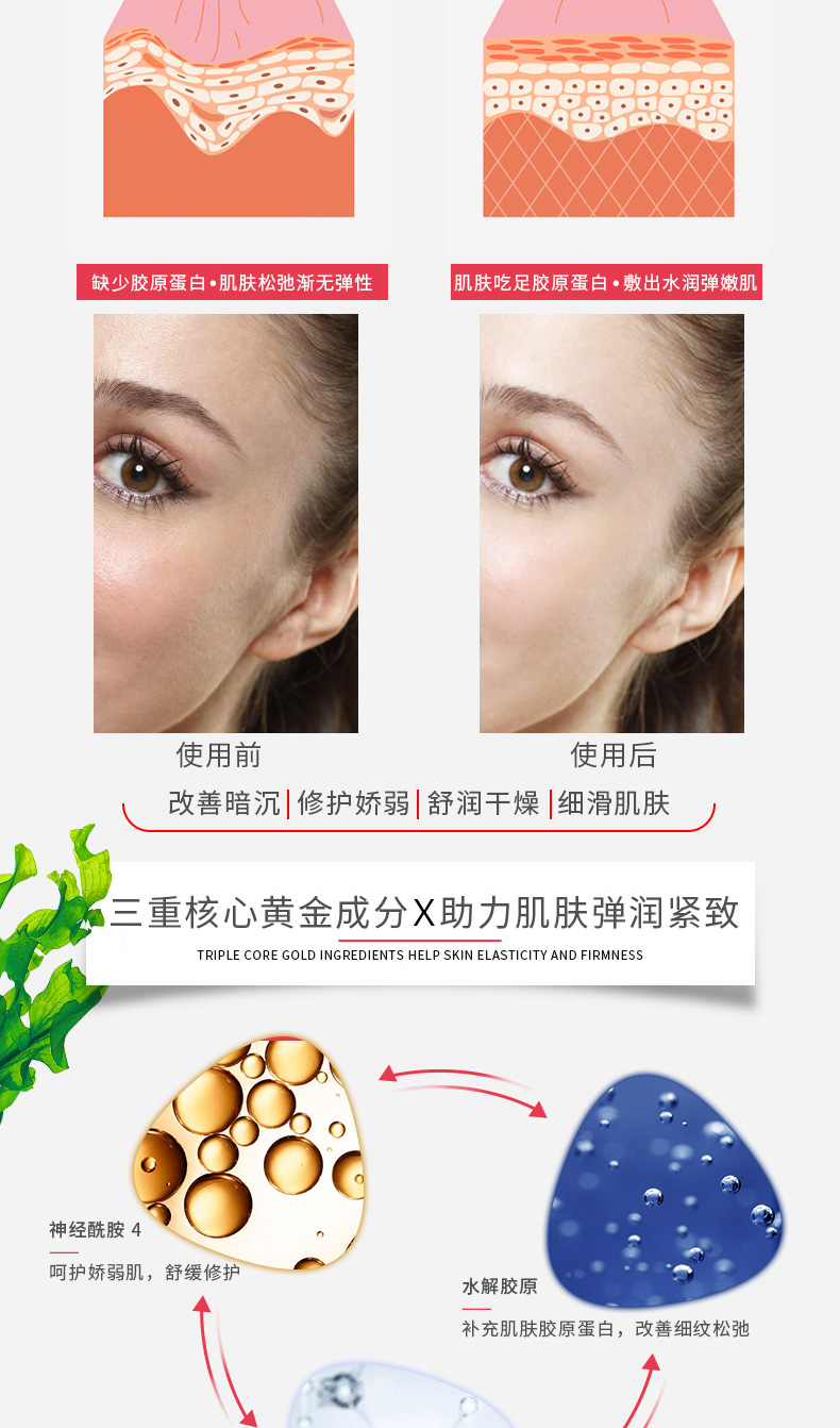 蕴含胶原蛋白成分,补充肌肤水分,清爽不粘腻,修护干燥、起皮的肌肤,细滑的护肤体验,给予肌肤滋养润泽,让肌肤紧弹细腻,绽现水光肌。