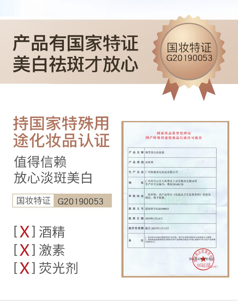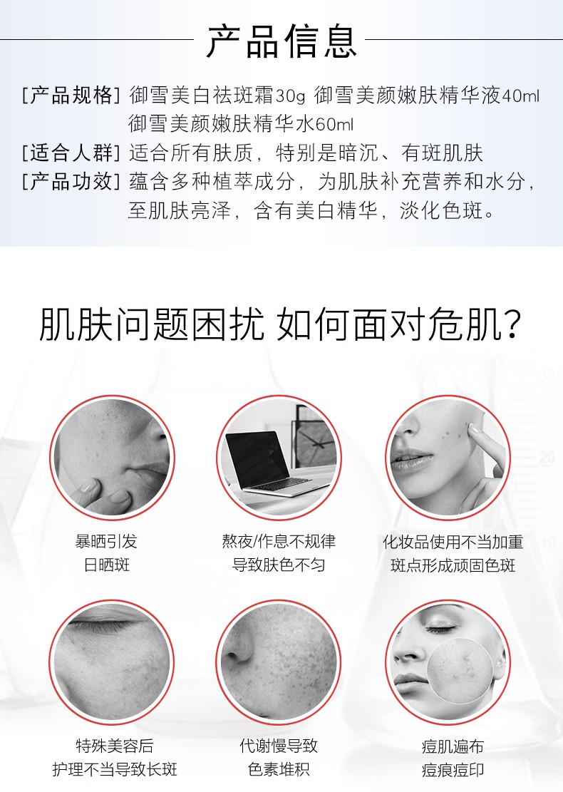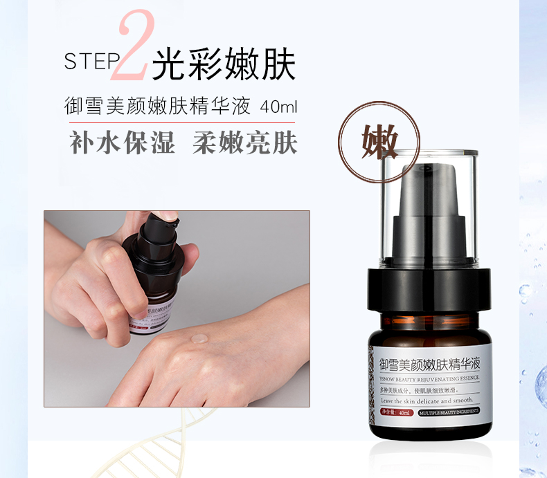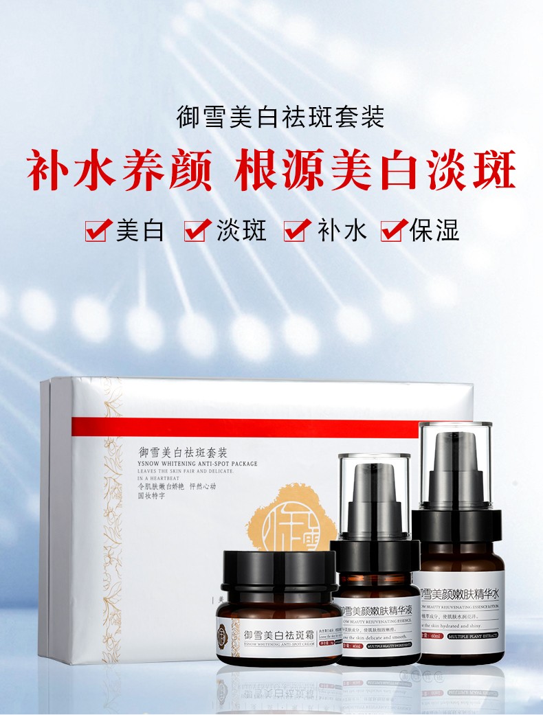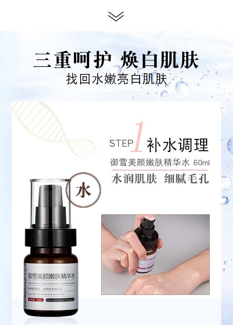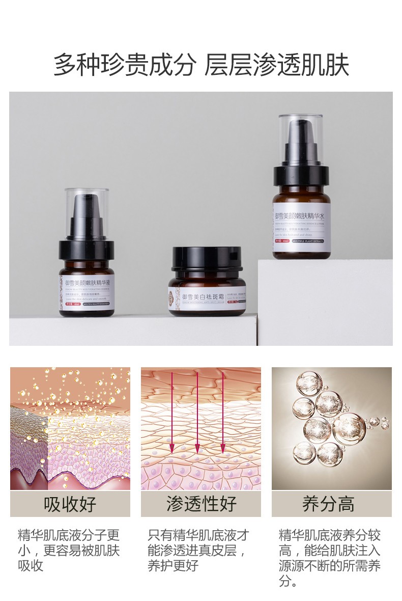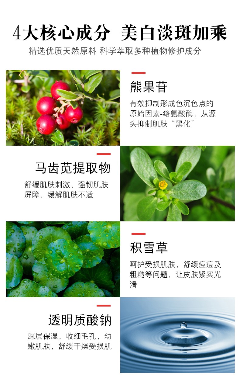 本品含美白精华,淡化色斑;含植物萃取精华,补水保湿,促进养分吸收;长期使用,令肌肤嫩白、弹滑